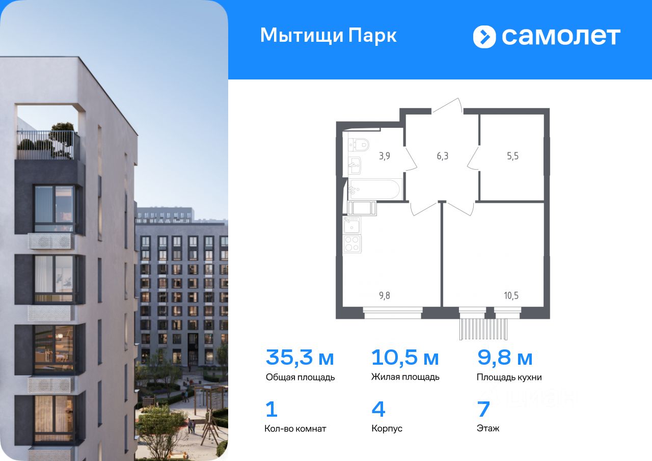 Предлагается 1-комнатная квартира комфорт-класса 35,3 кв.м в корпусе 4 на 7 этаже, в ЖК ''Мытищи Парк'' Квартира с чистовой отделкой. Доступность дополнительных опций уточняйте у застройщика.