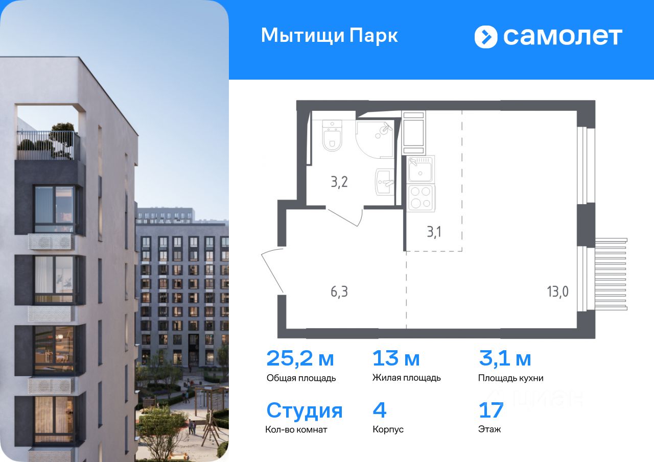 Предлагается квартира студия комфорт-класса 25,2 кв.м в корпусе 4 на 17 этаже, в ЖК ''Мытищи Парк'' Квартира с чистовой отделкой. Доступность дополнительных опций уточняйте у застройщика.