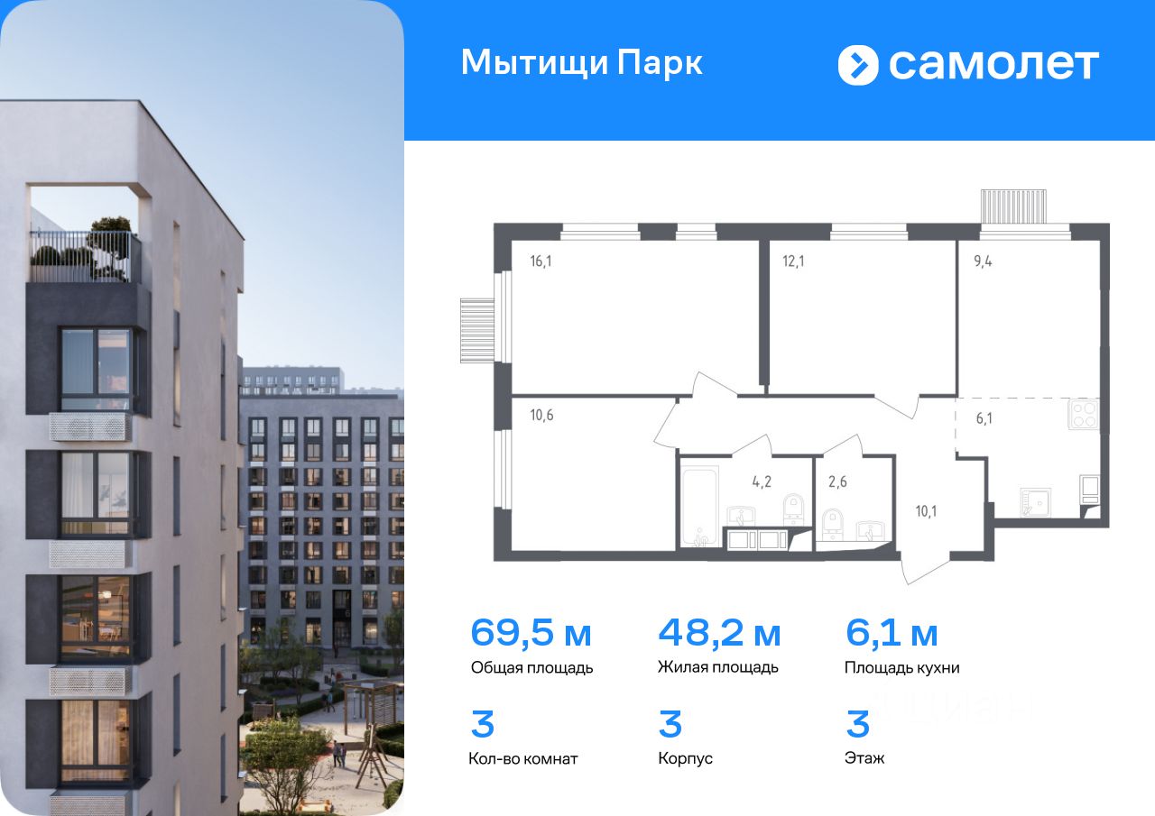 Предлагается 3-комнатная квартира комфорт-класса 69,5 кв.м в корпусе 3 на 3 этаже, в ЖК ''Мытищи Парк''