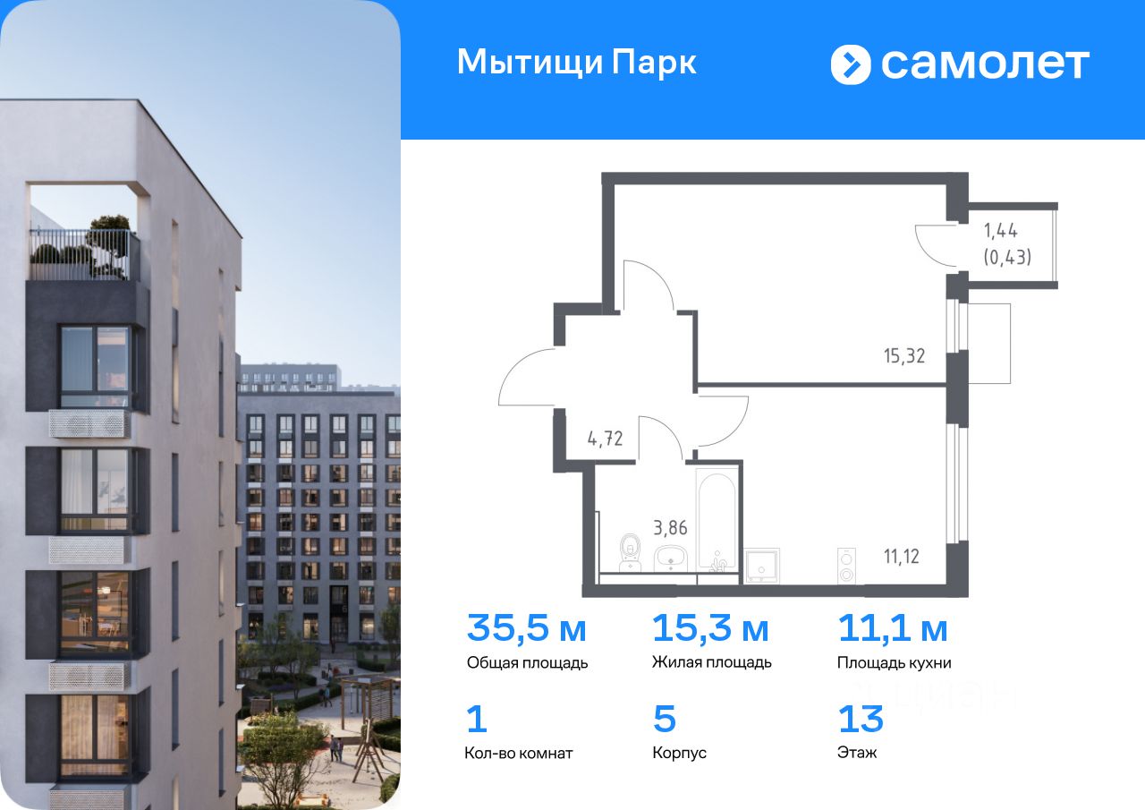 Предлагается 1-комнатная квартира комфорт-класса 35,45 кв.м в корпусе 5 на 13 этаже, в ЖК ''Мытищи Парк''