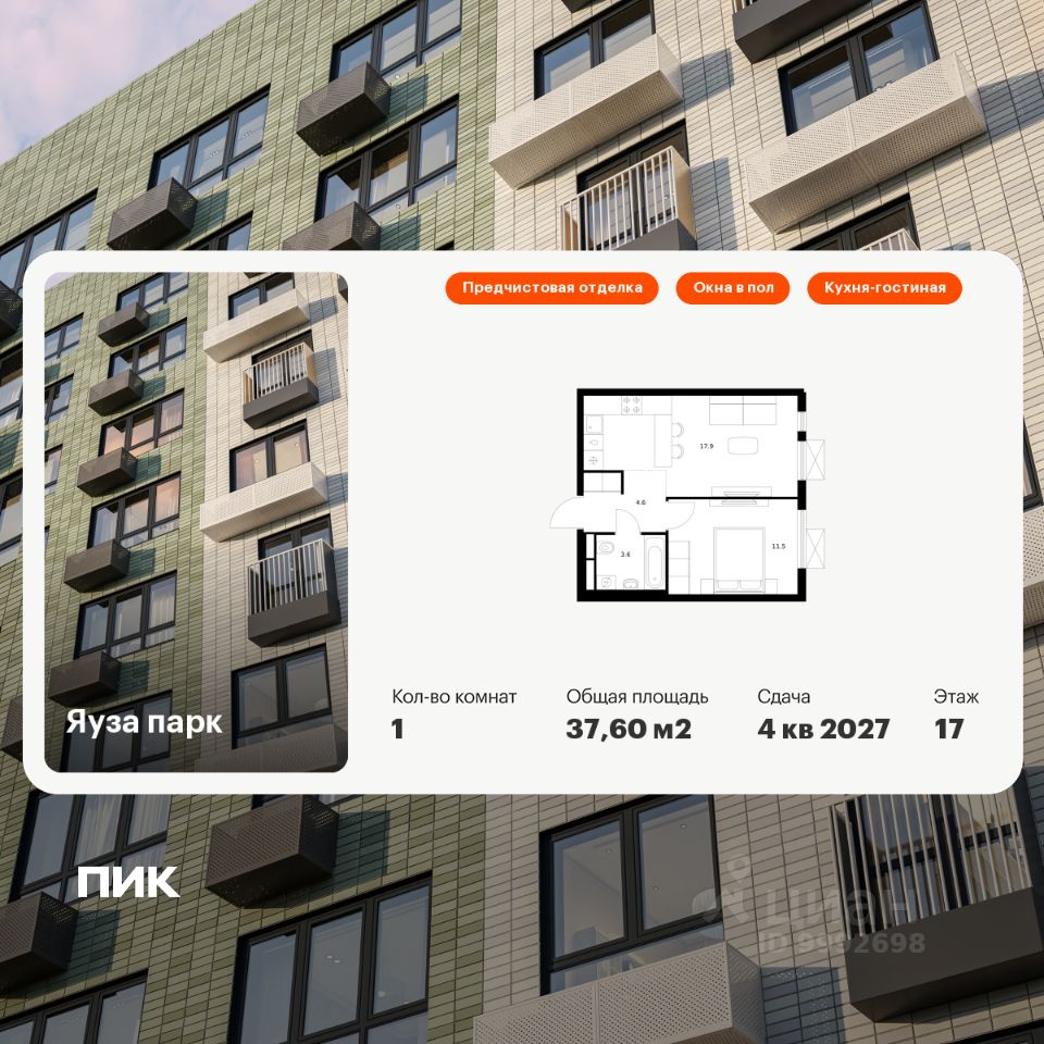 Продаётся 1-комн. квартира площадью 37,6 кв.м на 17 этаже 24 этажного дома (Корпус 10, Секция 1) проекта ПИК Яуза парк. Светлый просторный подъезд на уровне земли, функциональная планировка, большие окна, предчистовая отделка.