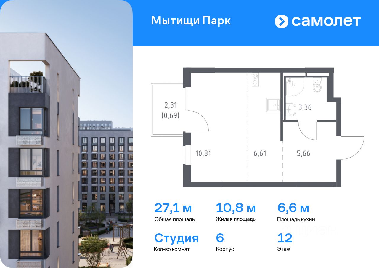 Предлагается квартира студия комфорт-класса 27,13 кв.м в корпусе 6 на 12 этаже, в ЖК ''Мытищи Парк''