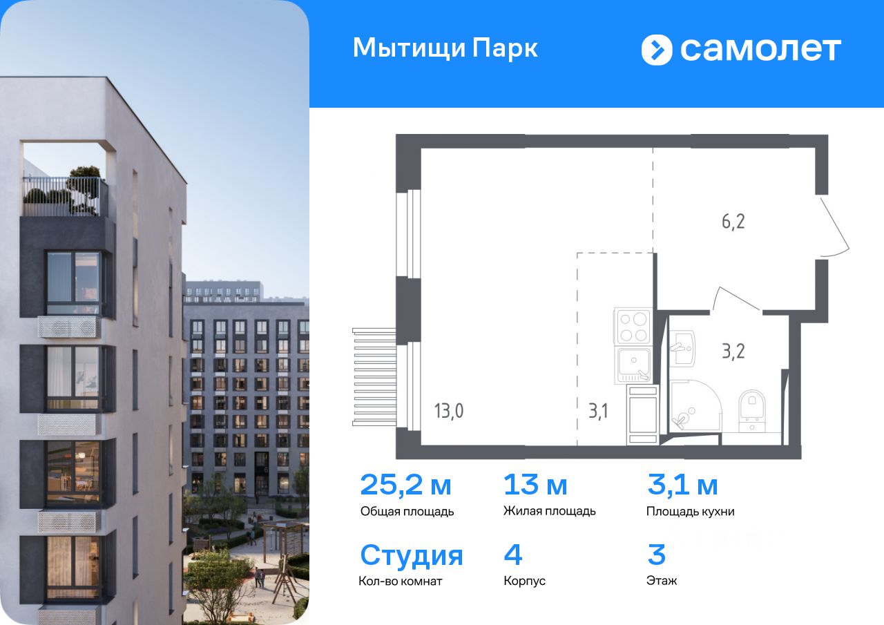 Предлагается квартира студия комфорт-класса 25,2 кв.м в корпусе 4 на 3 этаже, в ЖК ''Мытищи Парк''