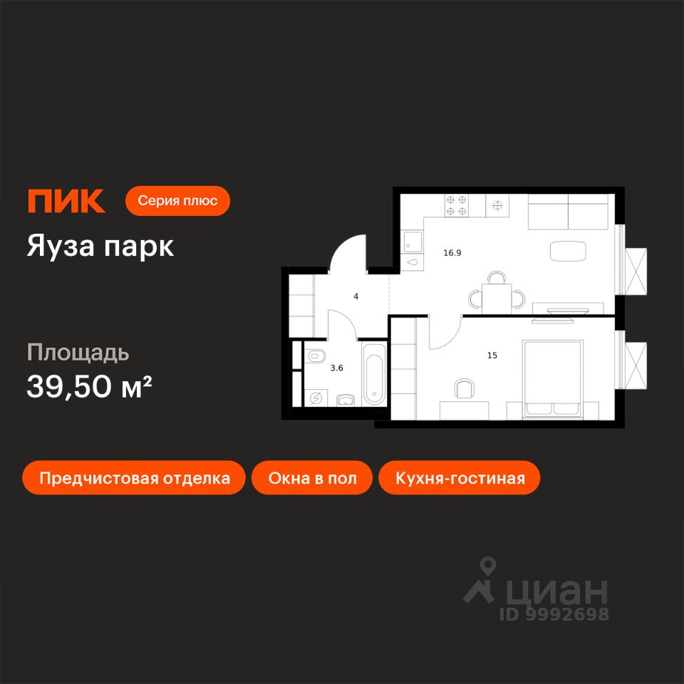 Продаётся 1-комн. квартира площадью 39,5 кв.м на 19 этаже 24 этажного дома (Корпус 10, Секция 1) проекта ПИК Яуза парк. Светлый просторный подъезд на уровне земли, функциональная планировка, большие окна, предчистовая отделка.