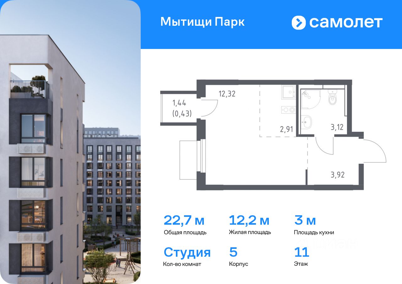 Предлагается квартира студия комфорт-класса 22,7 кв.м в корпусе 5 на 11 этаже, в ЖК ''Мытищи Парк'' Квартира без отделки. Доступность опции ''отделка'' и возможность комплектации мебелью и декором уточняйте у застройщика.