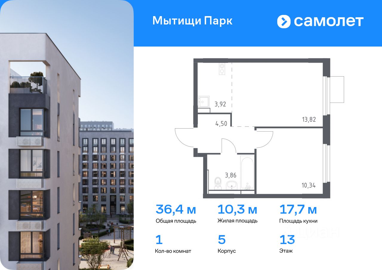 Предлагается 1-комнатная квартира комфорт-класса 36,44 кв.м в корпусе 5 на 13 этаже, в ЖК ''Мытищи Парк''