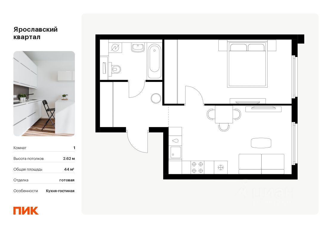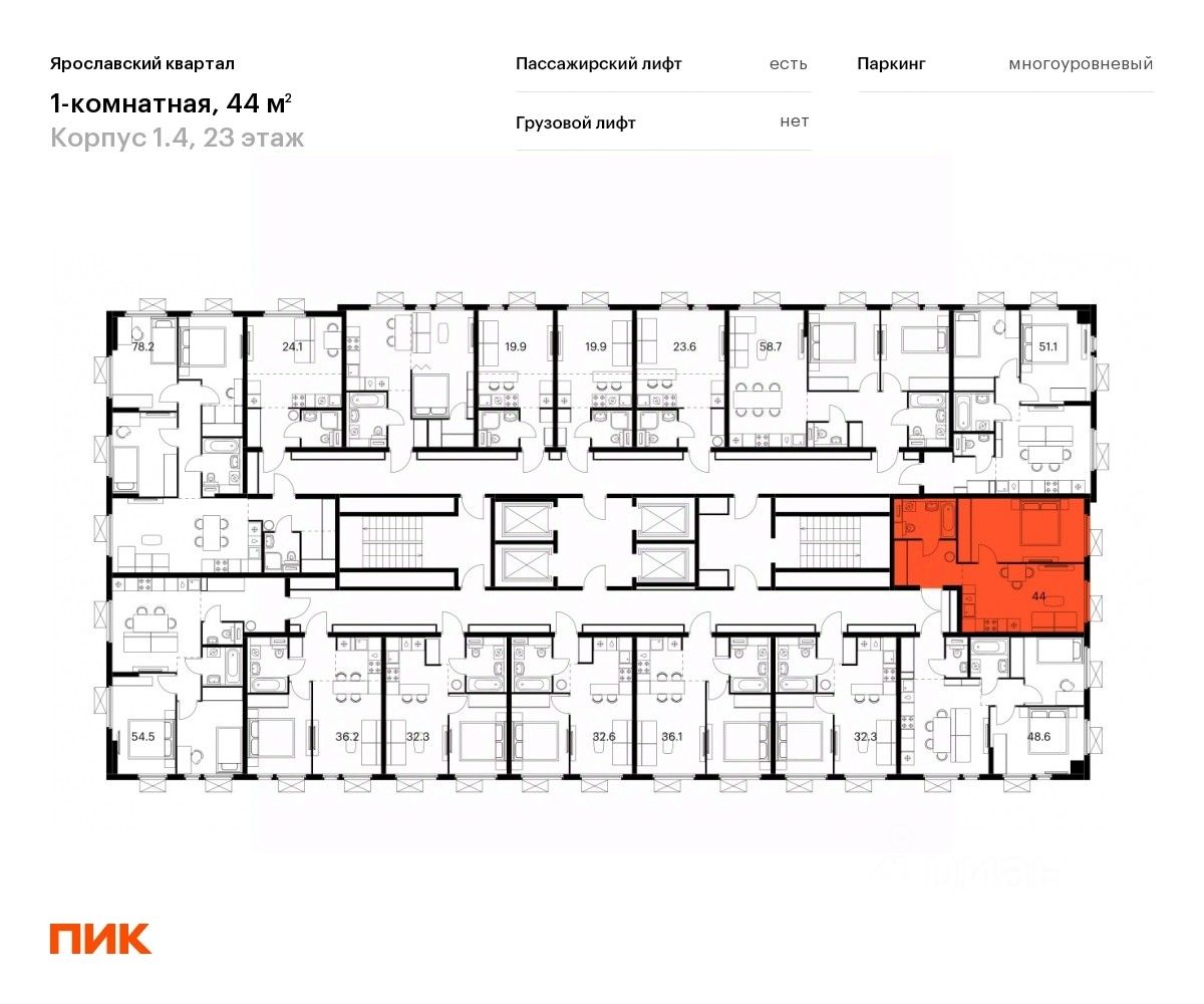 Продаётся 1-комн. квартира площадью 44 кв.м на 23 этаже 25 этажного дома (Корпус 1.4, Секция 1) проекта ПИК Ярославский квартал. Светлый просторный подъезд на уровне земли, функциональная планировка, большие окна, c отделкой.