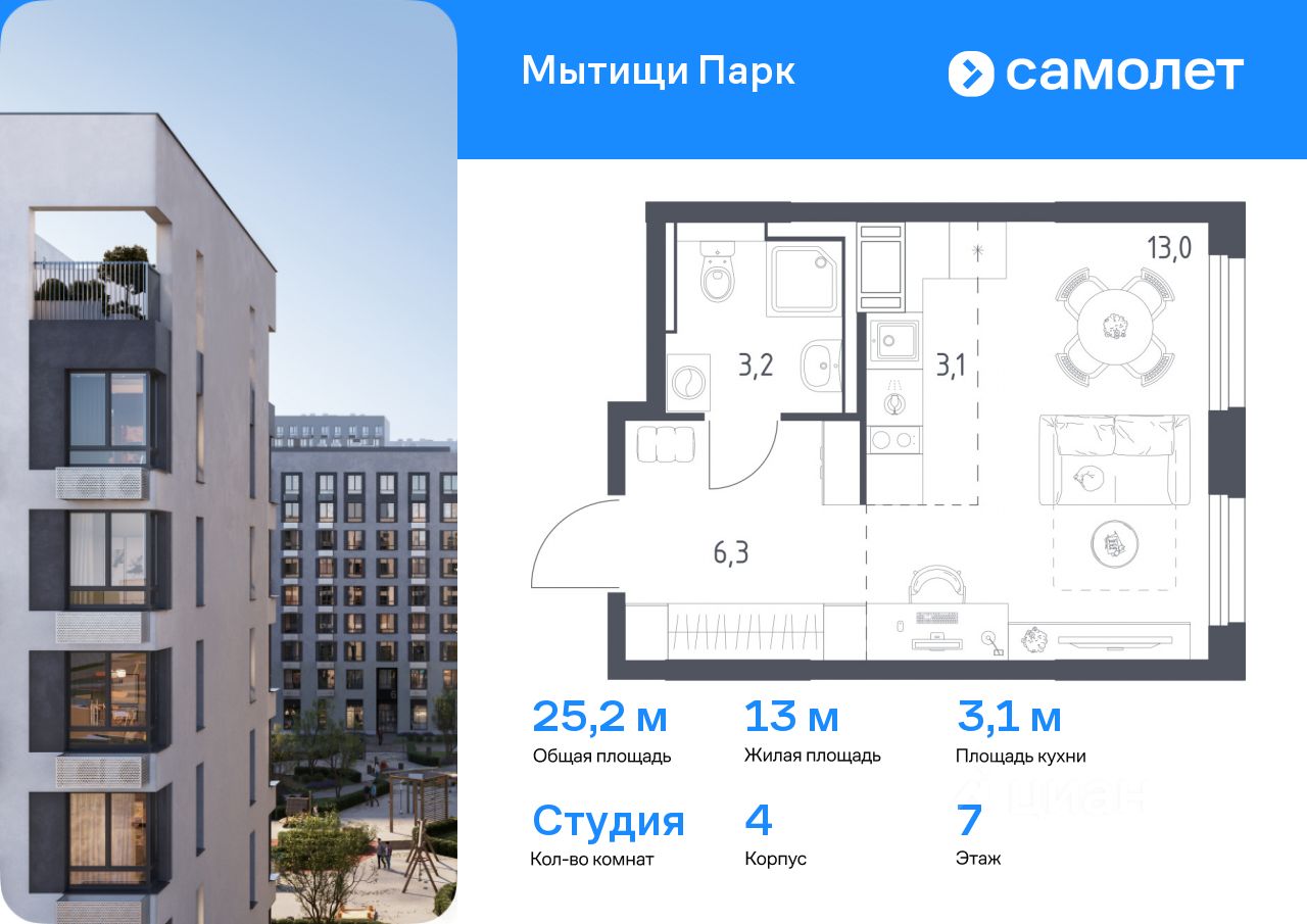 Предлагается квартира студия комфорт-класса 25,2 кв.м в корпусе 4 на 7 этаже, в ЖК ''Мытищи Парк''