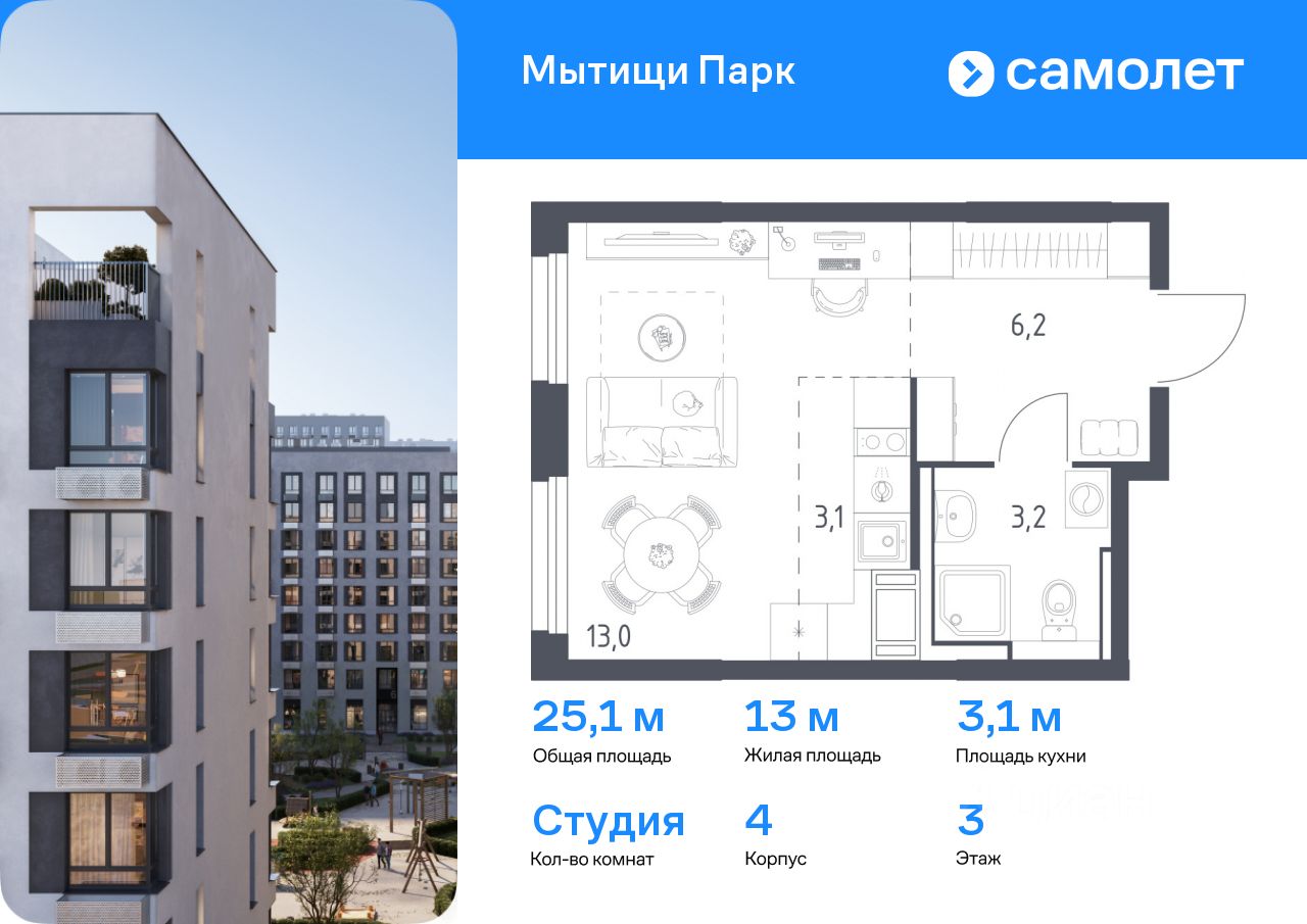Предлагается квартира студия комфорт-класса 25,1 кв.м в корпусе 4 на 3 этаже, в ЖК ''Мытищи Парк'' Квартира с чистовой отделкой. Доступность дополнительных опций уточняйте у застройщика.
