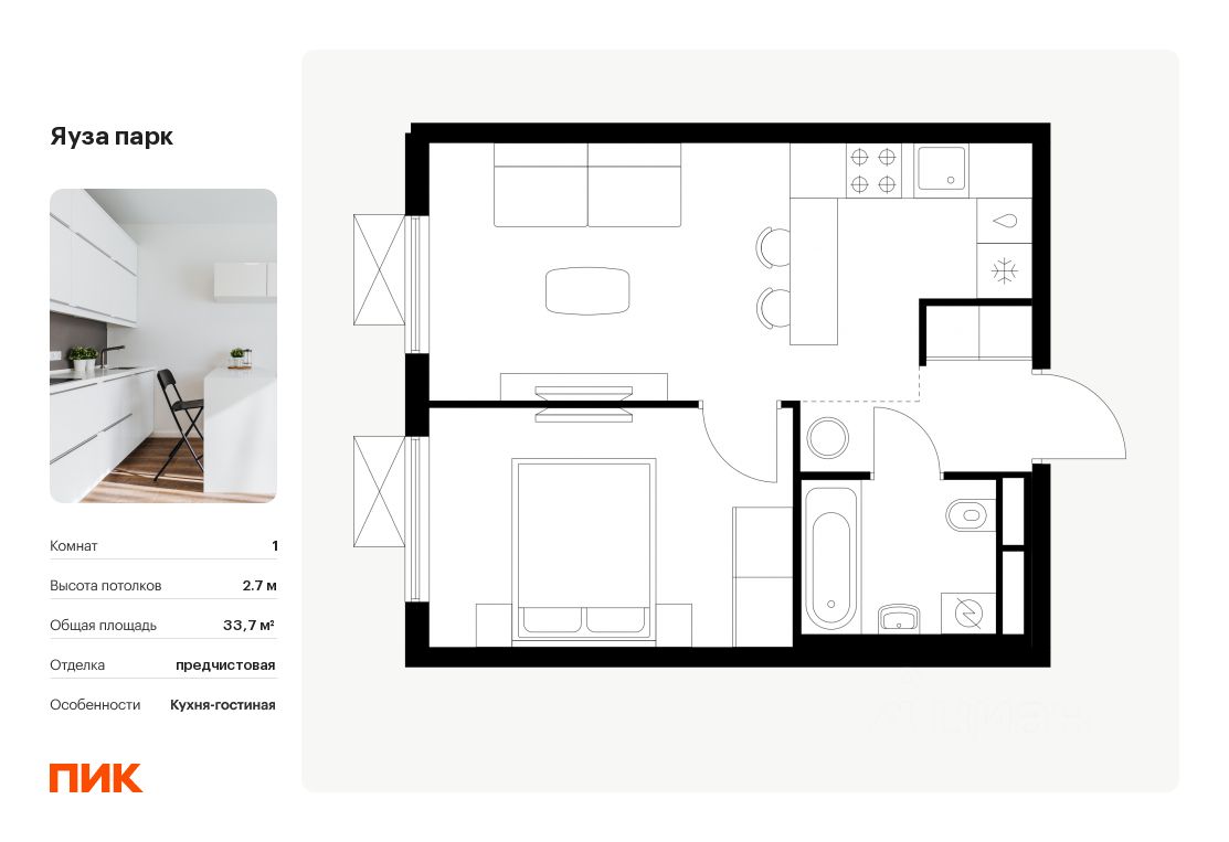 Продаётся 1-комн. квартира площадью 33,7 кв.м на 4 этаже 24 этажного дома (Корпус 10, Секция 1) проекта ПИК Яуза парк. Светлый просторный подъезд на уровне земли, функциональная планировка, большие окна, .