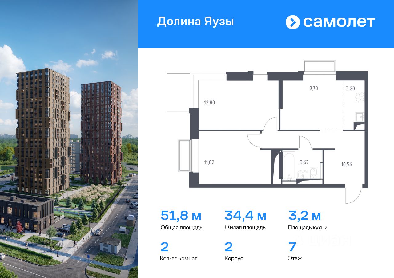Предлагается 2-комнатная квартира комфорт-класса 51,83 кв.м в корпусе 2 на 7 этаже, в ЖК ''Долина Яузы'' Квартира с чистовой отделкой. Доступность дополнительных опций уточняйте у застройщика.