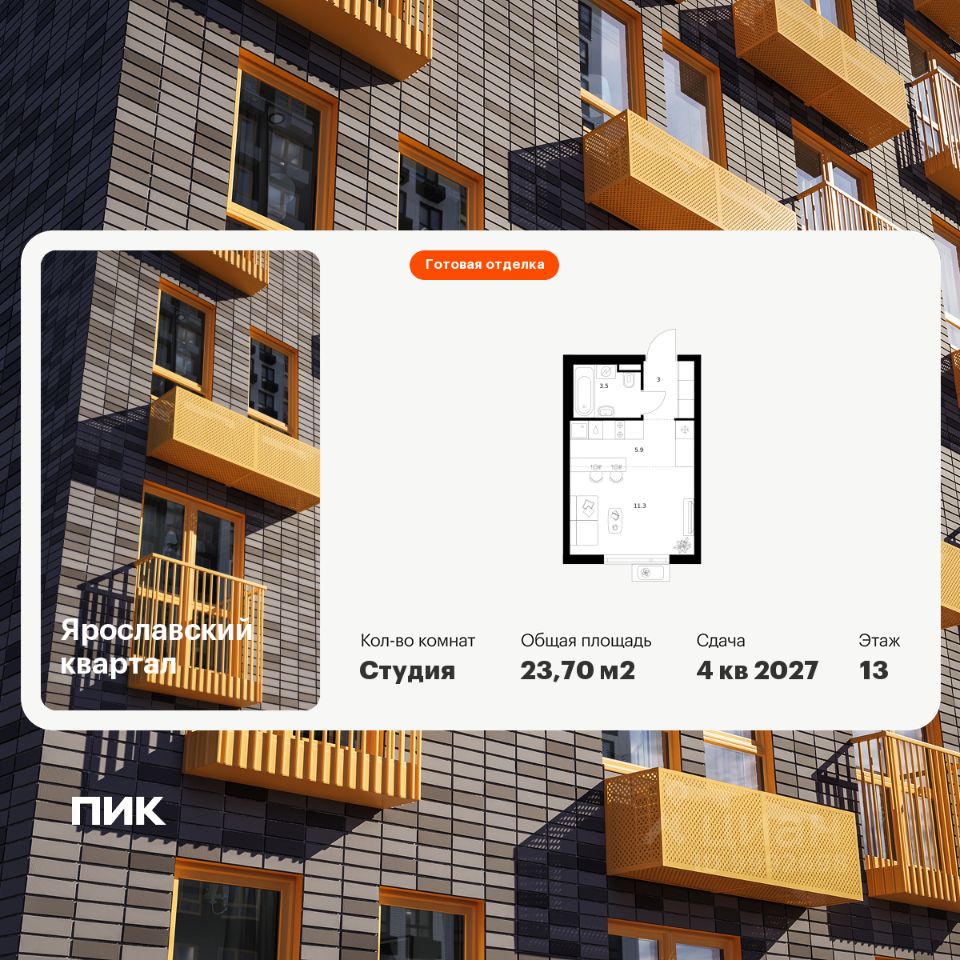 Продаётся квартира-студия площадью 23,7 кв.м на 13 этаже 25 этажного дома (Корпус 2.4, Секция 1) проекта ПИК Ярославский квартал. Светлый просторный подъезд на уровне земли, функциональная планировка, большие окна, c отделкой.