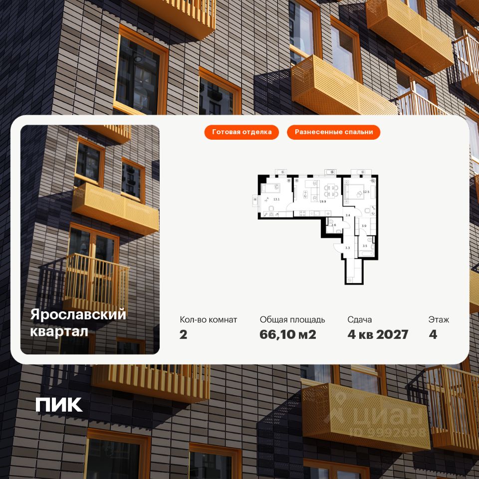 Продаётся 2-комн. квартира площадью 66,1 кв.м на 4 этаже 25 этажного дома (Корпус 2.4, Секция 1) проекта ПИК Ярославский квартал. Светлый просторный подъезд на уровне земли, функциональная планировка, большие окна, c отделкой.