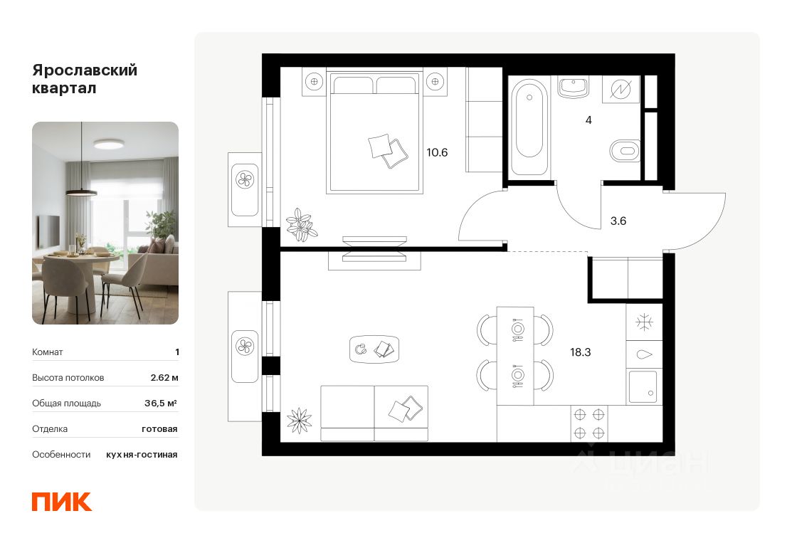 Продаётся 1-комн. квартира площадью 36,5 кв.м на 6 этаже 25 этажного дома (Корпус 2.4, Секция 1) проекта ПИК Ярославский квартал. Светлый просторный подъезд на уровне земли, функциональная планировка, большие окна, c отделкой.