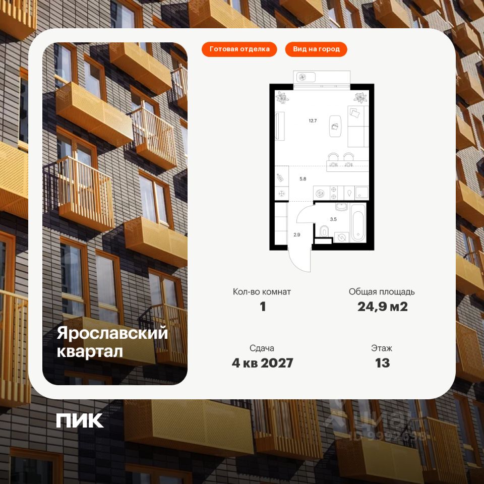 Продаётся квартира-студия площадью 24,9 кв.м на 13 этаже 25 этажного дома (Корпус 2.2, Секция 1) проекта ПИК Ярославский квартал. Светлый просторный подъезд на уровне земли, функциональная планировка, большие окна, c отделкой.