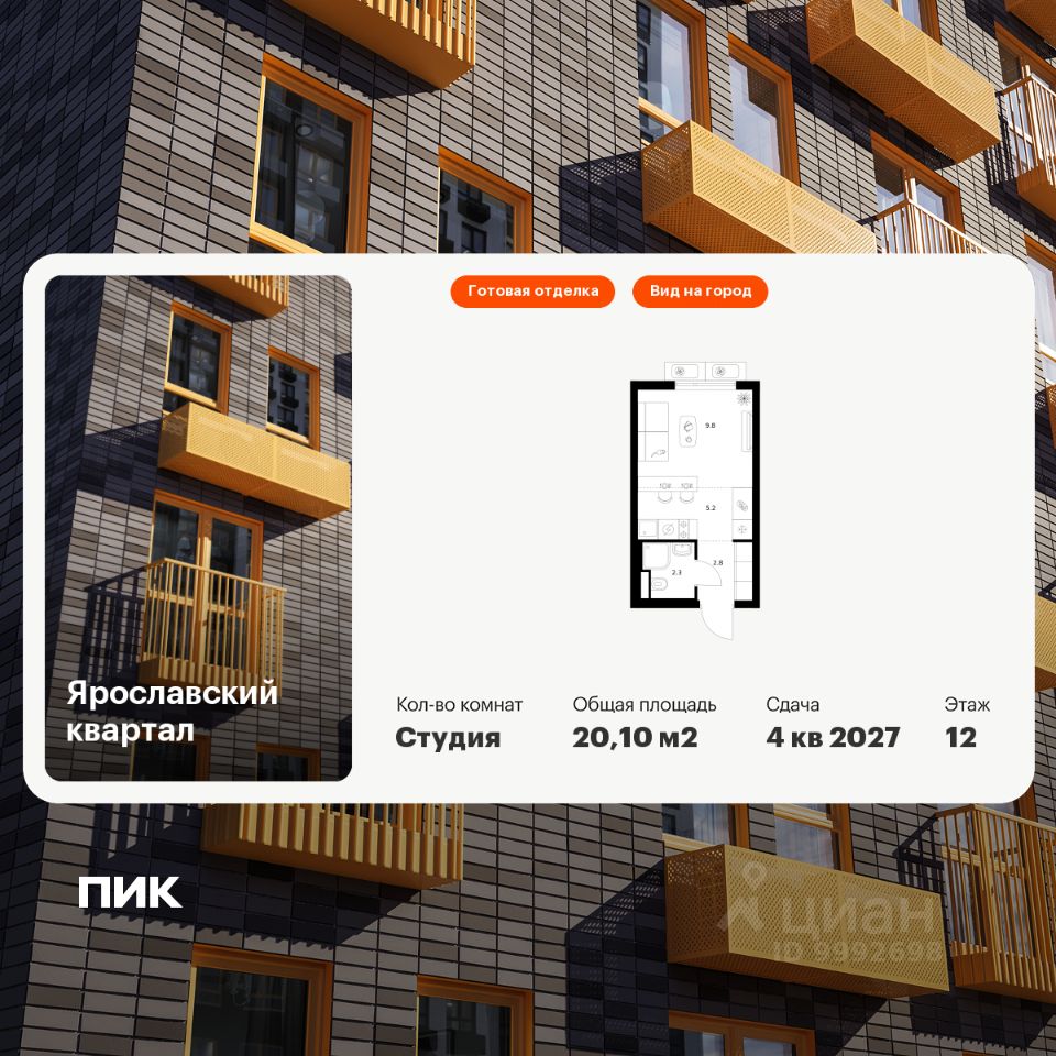 Продаётся квартира-студия площадью 20,1 кв.м на 12 этаже 25 этажного дома (Корпус 2.2, Секция 1) проекта ПИК Ярославский квартал. Светлый просторный подъезд на уровне земли, функциональная планировка, большие окна, c отделкой.