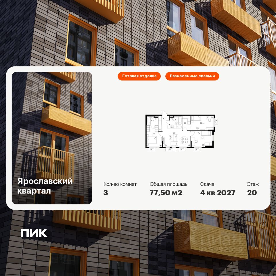 Продаётся 3-комн. квартира площадью 77,5 кв.м на 20 этаже 25 этажного дома (Корпус 2.4, Секция 1) проекта ПИК Ярославский квартал. Светлый просторный подъезд на уровне земли, функциональная планировка, большие окна, c отделкой.