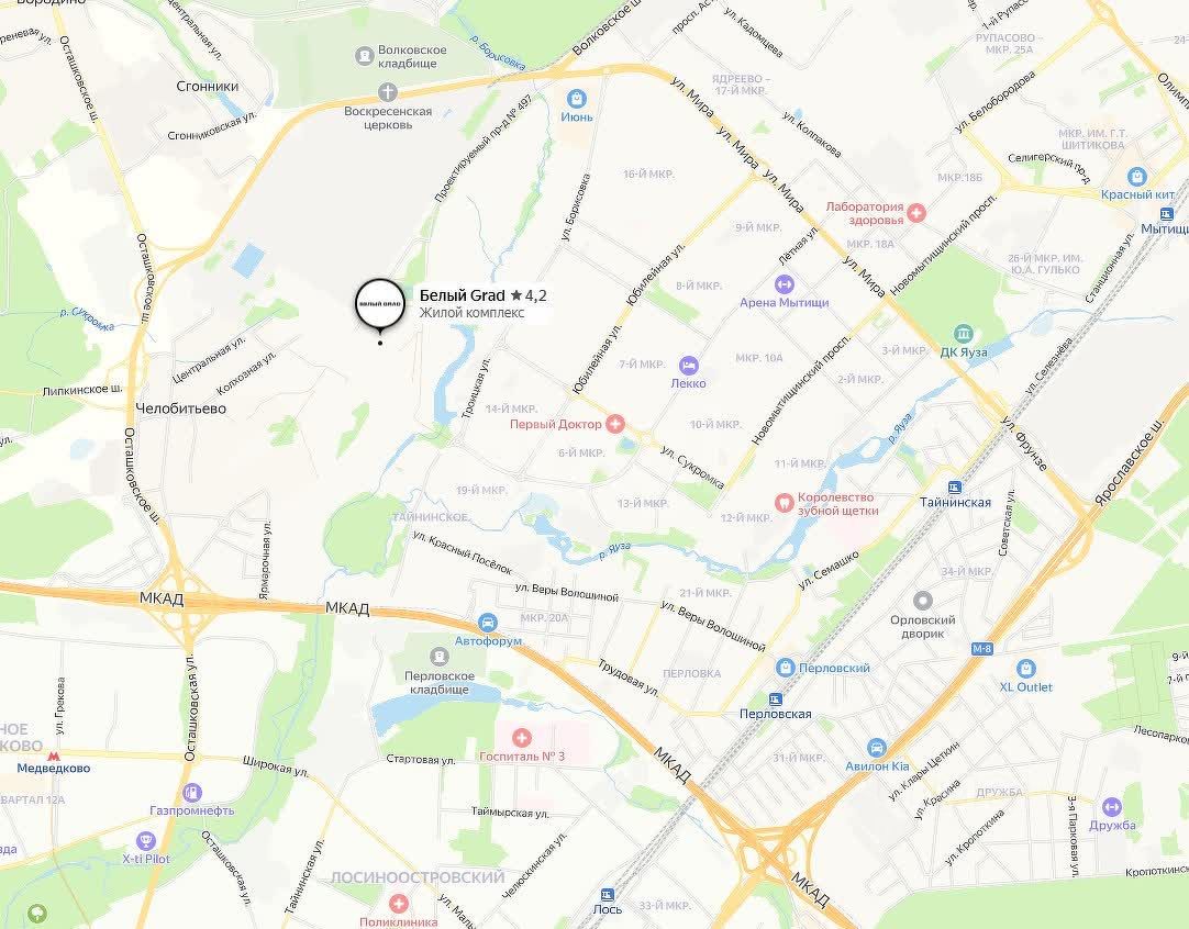 Инфраструктура: Доступность до метро Медведково -10 минут на транспорте. Город со своими школами и детскими садами. ФОК, ТЦ, административно-офисные здания, паркинги. Заповедное место, окруженное рекой и живописной природой на территории с благородной историей