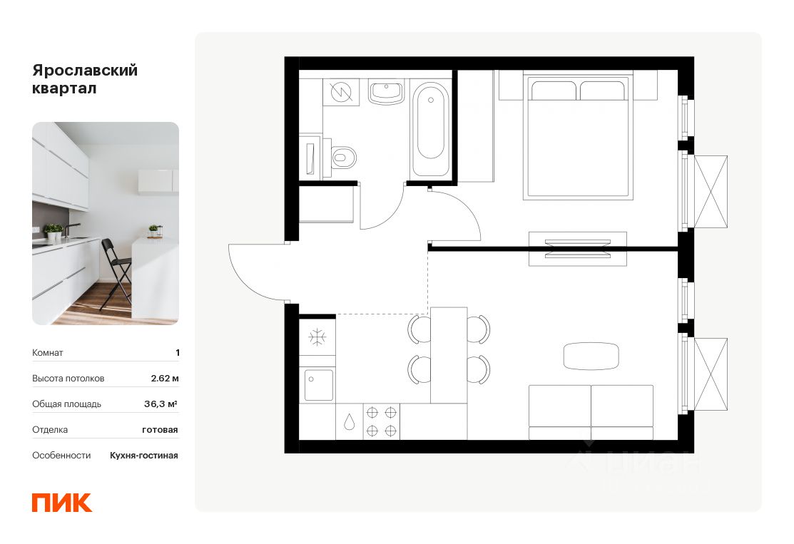 Продаётся 1-комн. квартира площадью 36,3 кв.м на 14 этаже 24 этажного дома (Корпус 1.3, Секция 1) проекта ПИК Ярославский квартал. Светлый просторный подъезд на уровне земли, функциональная планировка, большие окна, .