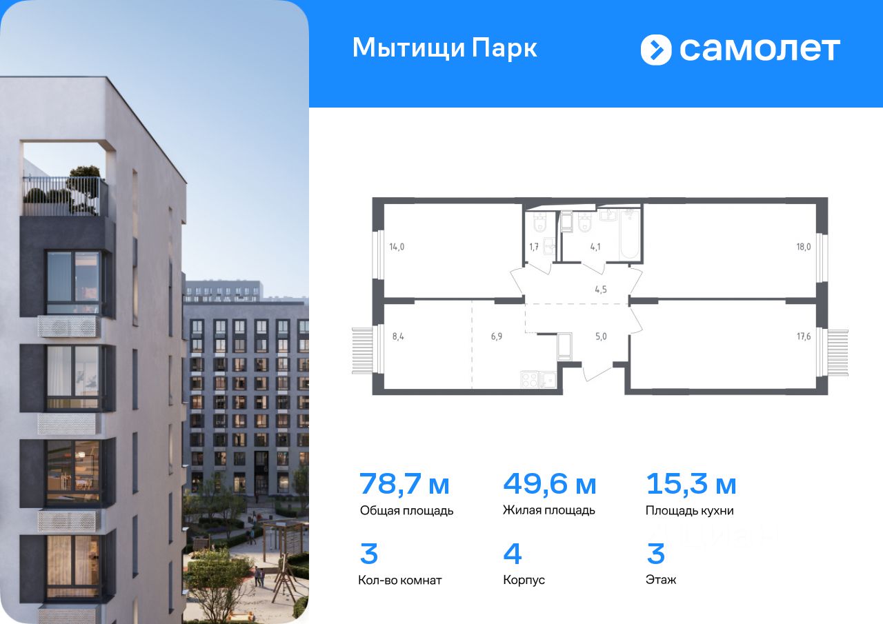 Предлагается 3-комнатная квартира комфорт-класса 78,7 кв.м в корпусе 4 на 3 этаже, в ЖК ''Мытищи Парк''