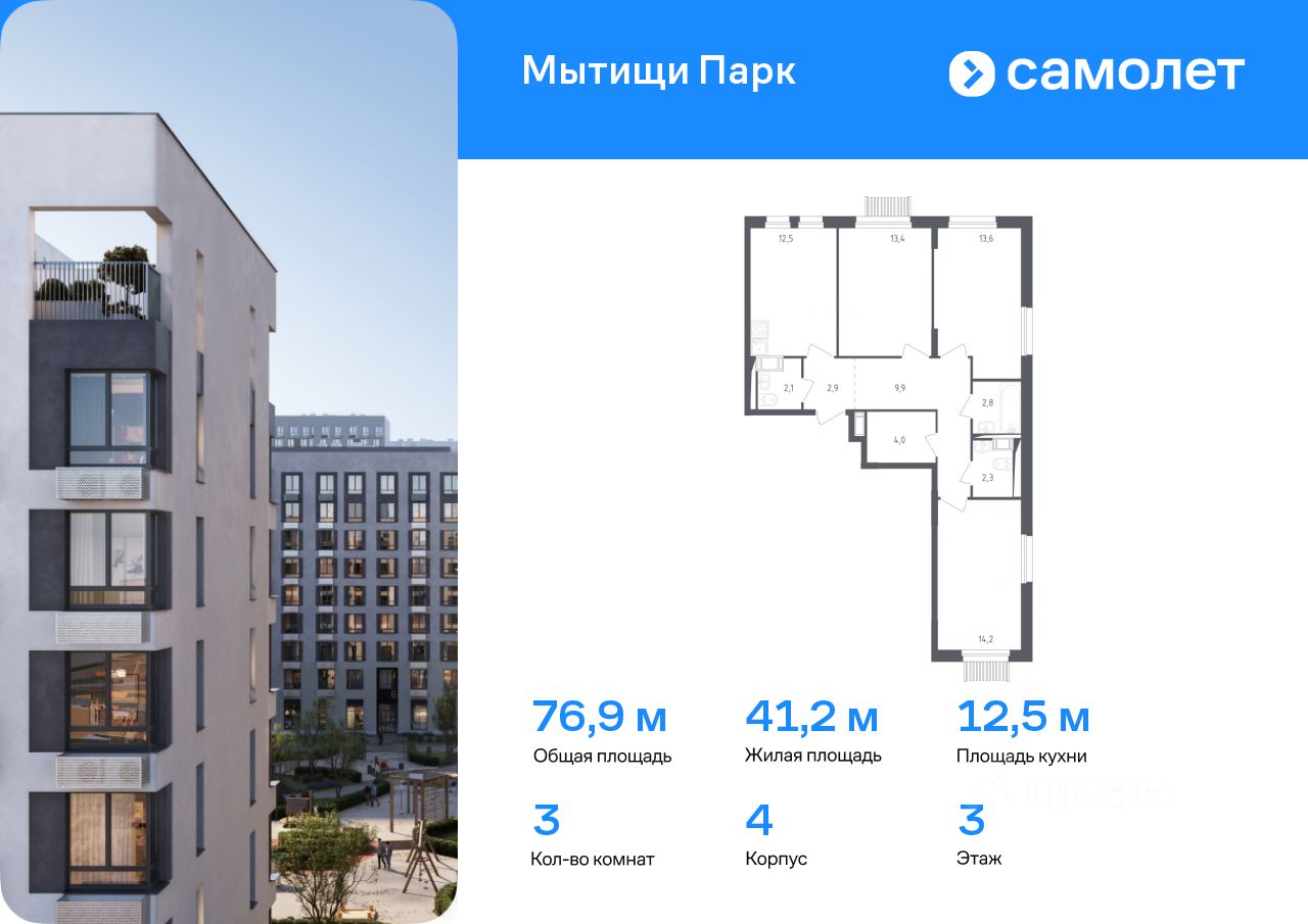 Предлагается 3-комнатная квартира комфорт-класса 76,9 кв.м в корпусе 4 на 3 этаже, в ЖК ''Мытищи Парк'' Квартира с чистовой отделкой. Доступность дополнительных опций уточняйте у застройщика.