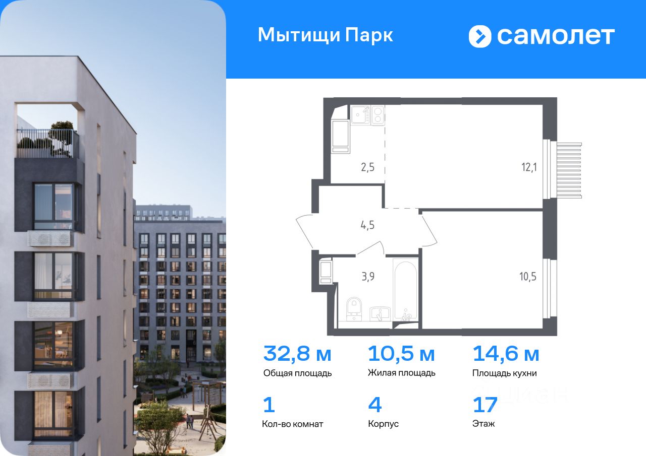 Предлагается 1-комнатная квартира комфорт-класса 32,8 кв.м в корпусе 4 на 17 этаже, в ЖК ''Мытищи Парк''