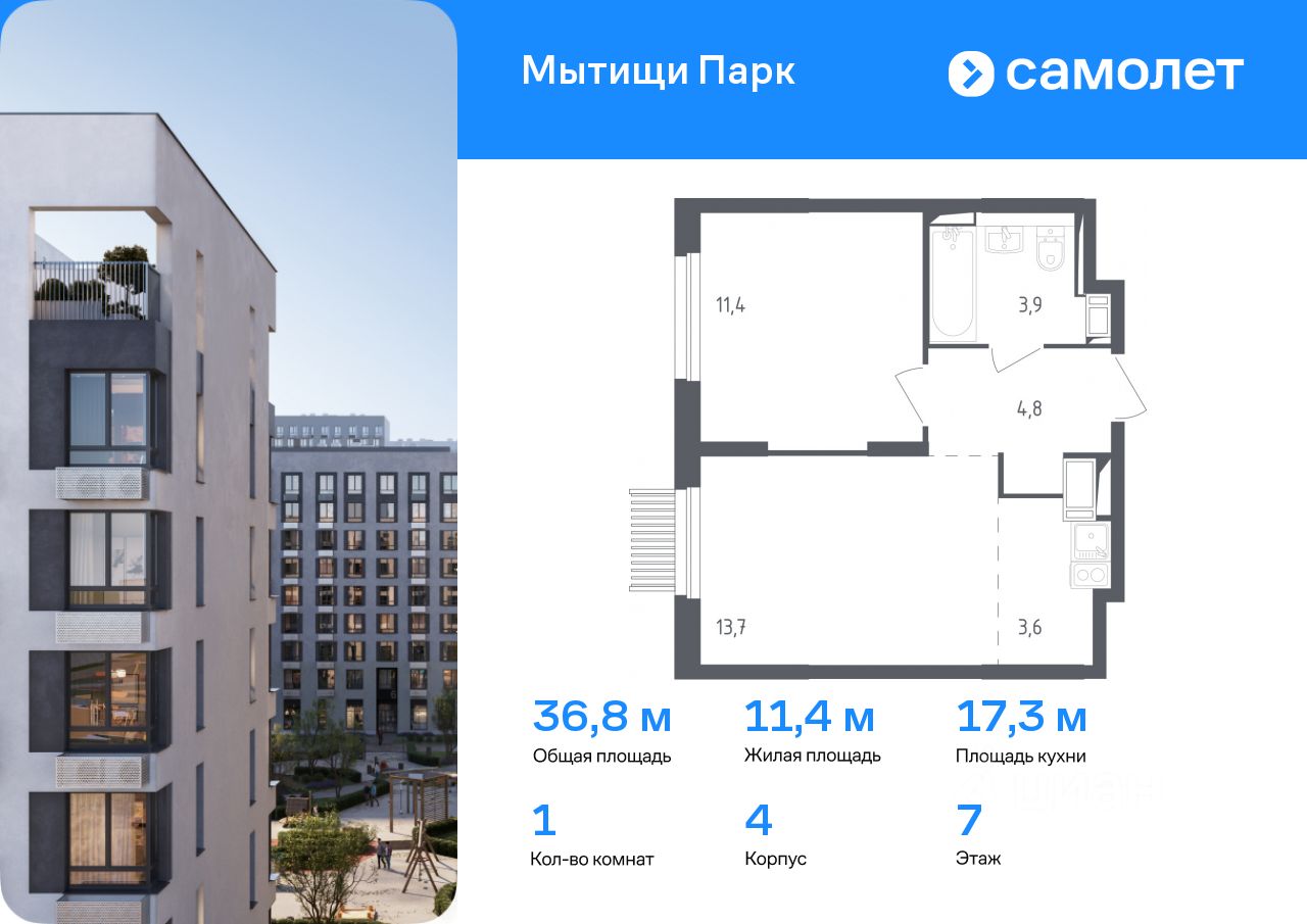 Предлагается 1-комнатная квартира комфорт-класса 36,8 кв.м в корпусе 4 на 7 этаже, в ЖК ''Мытищи Парк'' Квартира с чистовой отделкой. Доступность дополнительных опций уточняйте у застройщика.