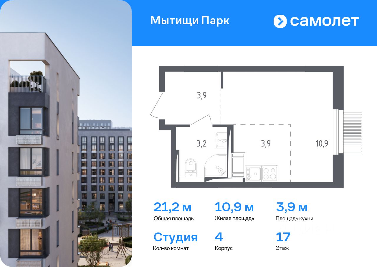 Предлагается квартира студия комфорт-класса 21,2 кв.м в корпусе 4 на 17 этаже, в ЖК ''Мытищи Парк'' Квартира с чистовой отделкой. Доступность дополнительных опций уточняйте у застройщика.