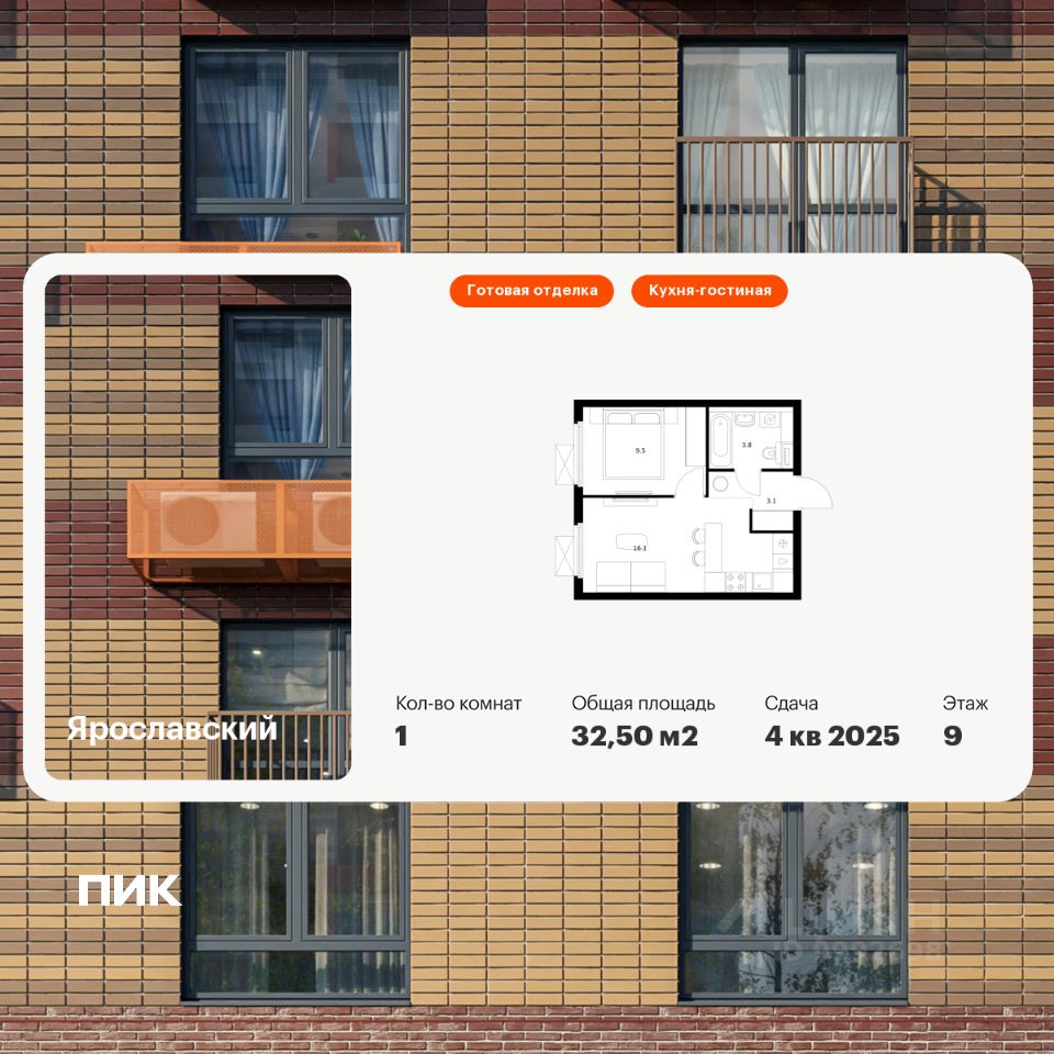 Продаётся 1-комн. квартира площадью 32,5 кв.м на 9 этаже 25 этажного дома (Корпус 16.1, Секция 1) проекта ПИК Ярославский. Светлый просторный подъезд на уровне земли, функциональная планировка, большие окна, c отделкой.