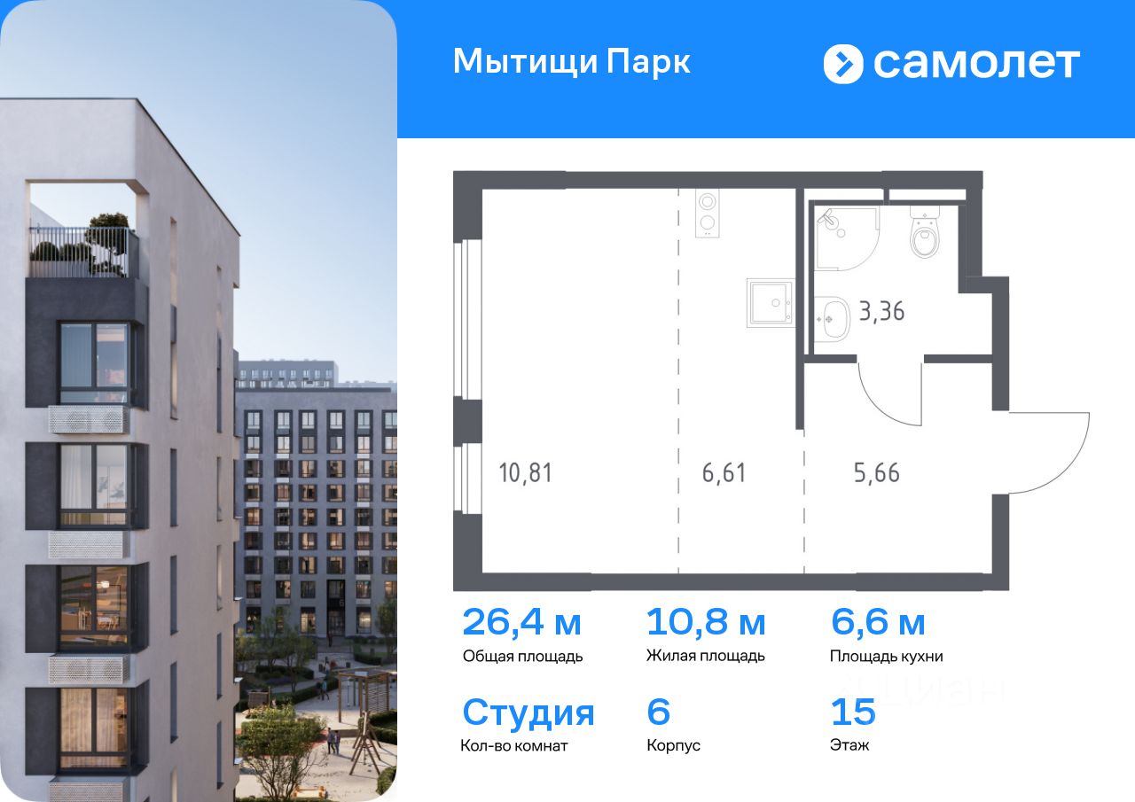 Предлагается квартира студия комфорт-класса 26,44 кв.м в корпусе 6 на 15 этаже, в ЖК ''Мытищи Парк''