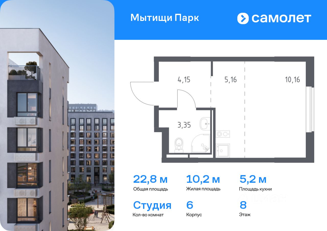 Предлагается квартира студия комфорт-класса 22,82 кв.м в корпусе 6 на 8 этаже, в ЖК ''Мытищи Парк'' Квартира без отделки. Доступность опции ''отделка'' и возможность комплектации мебелью и декором уточняйте у застройщика.