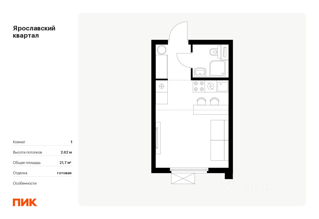 Продаётся квартира-студия площадью 21,7 кв.м на 12 этаже 24 этажного дома (Корпус 1.3, Секция 1) проекта ПИК Ярославский квартал. Светлый просторный подъезд на уровне земли, функциональная планировка, большие окна, c отделкой.