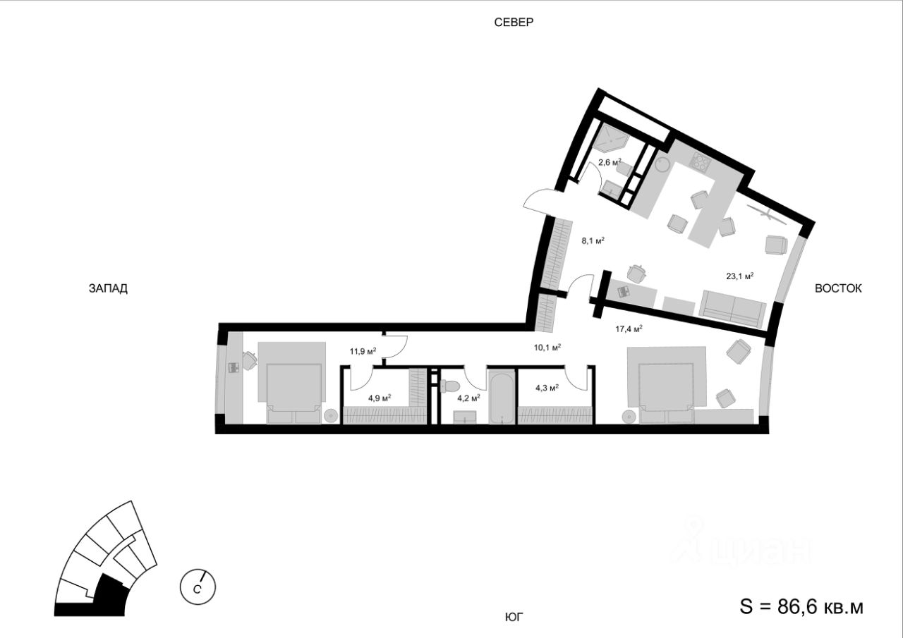 Продаётся 3-комнатная квартира в строящемся доме (Корпус 1), срок сдачи: I-кв. 2026, общей площадью 86.6 кв.м., на 14 этаже. Многоквартирный жилой дом со встроенно-пристроенными нежилыми помещениями и автостоянкой