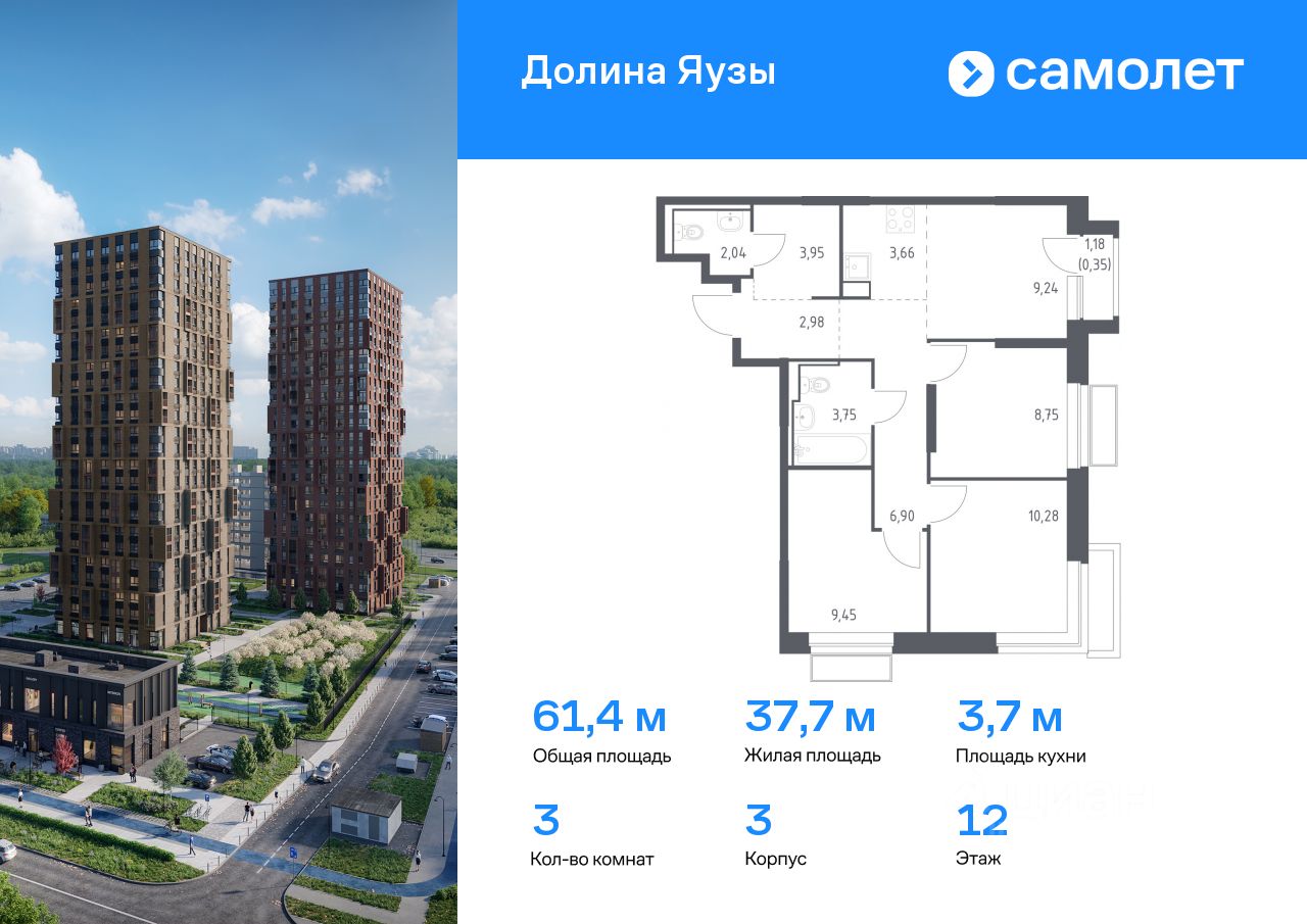 Предлагается 3-комнатная квартира комфорт-класса 61,35 кв.м в корпусе 3 на 12 этаже, в ЖК ''Долина Яузы'' Квартира с чистовой отделкой. Доступность дополнительных опций уточняйте у застройщика.