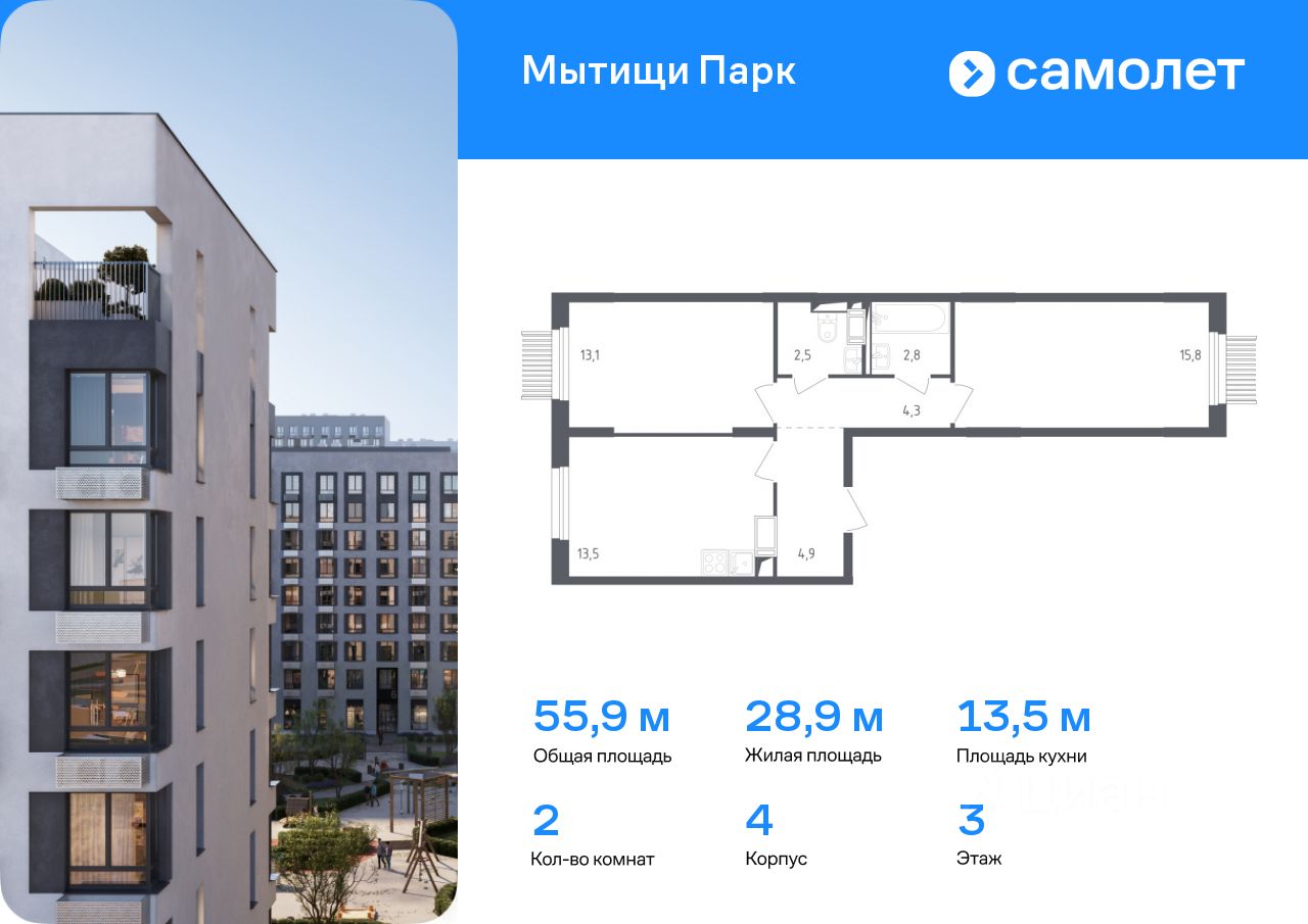 Предлагается 2-комнатная квартира комфорт-класса 55,9 кв.м в корпусе 4 на 3 этаже, в ЖК ''Мытищи Парк'' Квартира без отделки. Доступность опции ''отделка'' и возможность комплектации мебелью и декором уточняйте у застройщика.
