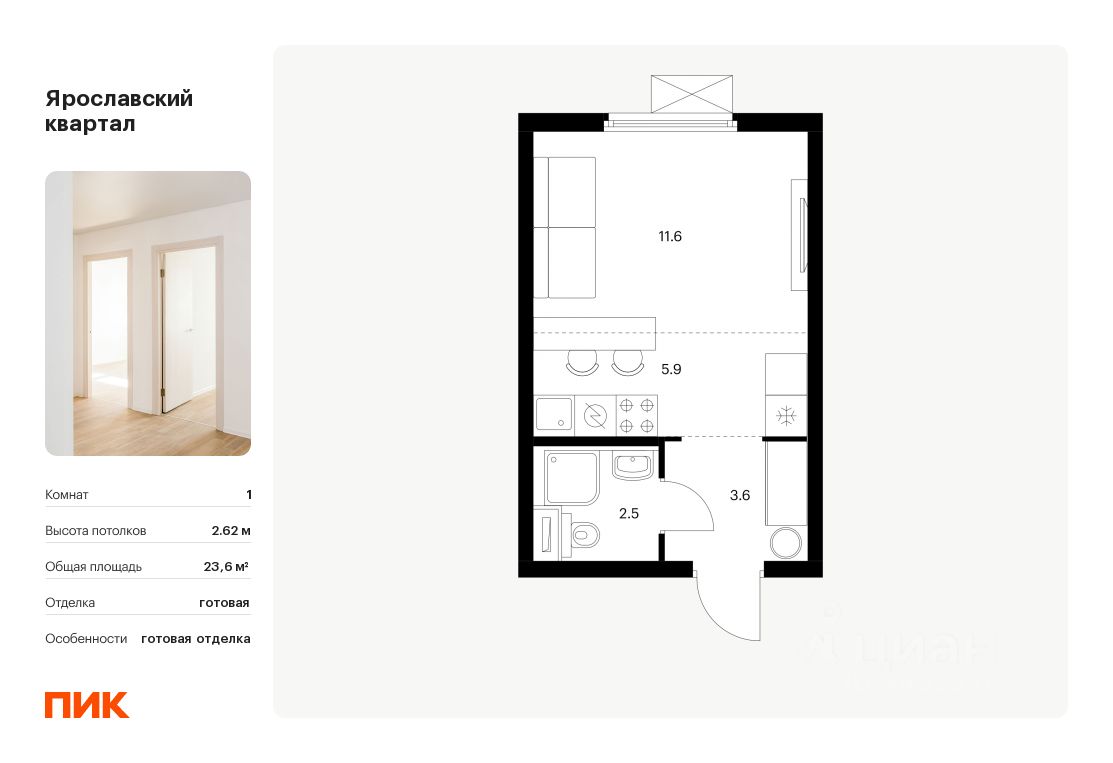 Продаётся квартира-студия площадью 23,6 кв.м на 12 этаже 25 этажного дома (Корпус 1.4, Секция 1) проекта ПИК Ярославский квартал. Светлый просторный подъезд на уровне земли, функциональная планировка, большие окна, c отделкой.