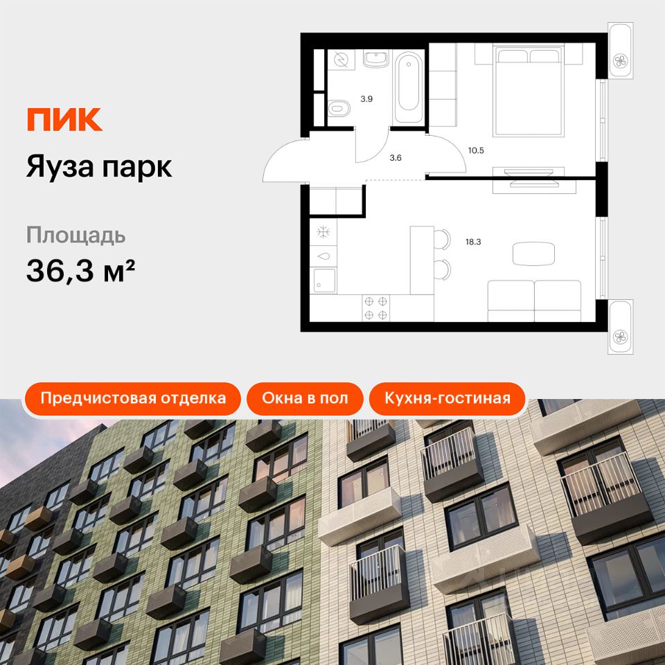 Продаётся 1-комн. квартира площадью 36,3 кв.м на 23 этаже 24 этажного дома (Корпус 12, Секция 1) проекта ПИК Яуза парк. Светлый просторный подъезд на уровне земли, функциональная планировка, большие окна, предчистовая отделка.