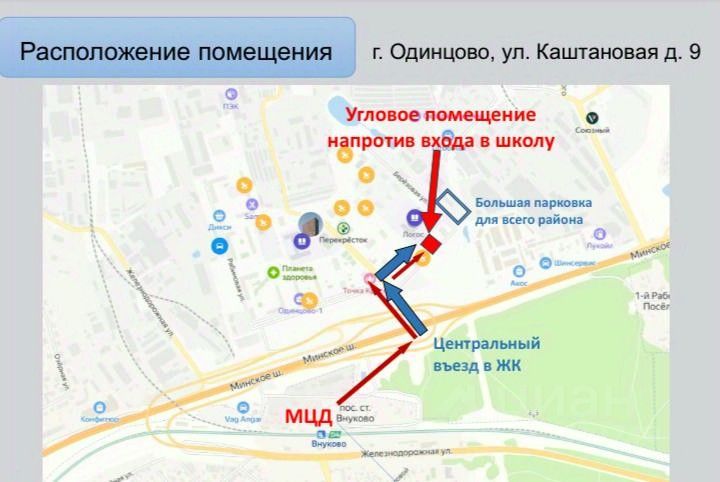 Помещение с отделкой, включены эксплуатационные платежи В доме отсутствует действующие ПВЗ высокие потолки: 4.1м На территории ЖК уже работают две школы и восемь детских садов, построены многоуровневые паркинги и строится муниципальная поликлиника помещение расположено Помещение расположено напротив входа в большую новую школу Логос, рассчитанную на 1550 мест. Рядом с кварталом две станции МЦД — ''Одинцово'' и ''Внуково'': до любой из них можно дойти пешком или доехать на автобусе за 510 минут.