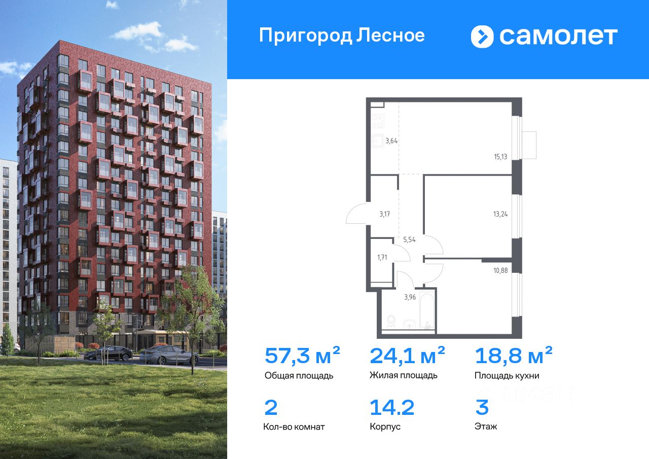 Предлагается 2-комнатная квартира комфорт-класса 57,27 кв.м в корпусе 14.2 на 3 этаже, в ЖК ''Пригород Лесное'' Квартира с чистовой отделкой. Доступность дополнительных опций уточняйте у застройщика.