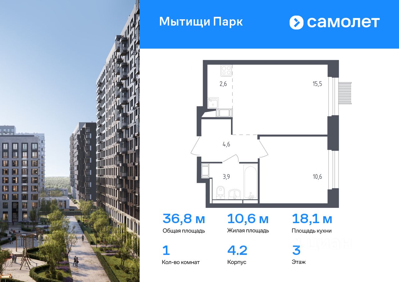 Предлагается 1-комнатная квартира комфорт-класса 36,8 кв.м в корпусе 4.2 на 3 этаже, в ЖК ''Мытищи Парк''