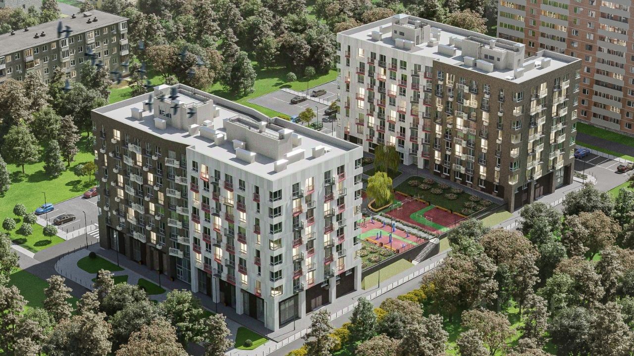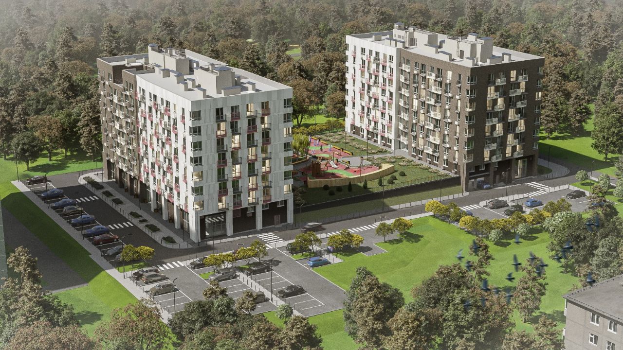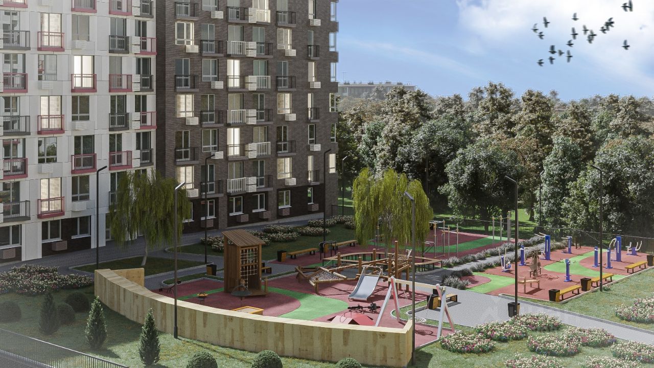 Проект жилого комплекса предусматривает наличие детской и спортивной площадок, кладовые помещения, гостевой паркинг и озеленение.
