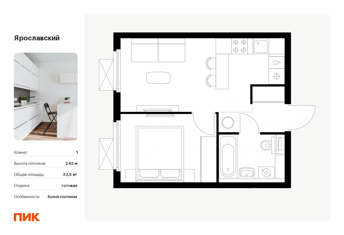Продаётся 1-комн. квартира площадью 32,5 кв.м на 11 этаже 25 этажного дома (Корпус 16.4, Секция 4) проекта ПИК Ярославский. Светлый просторный подъезд на уровне земли, функциональная планировка, большие окна, .