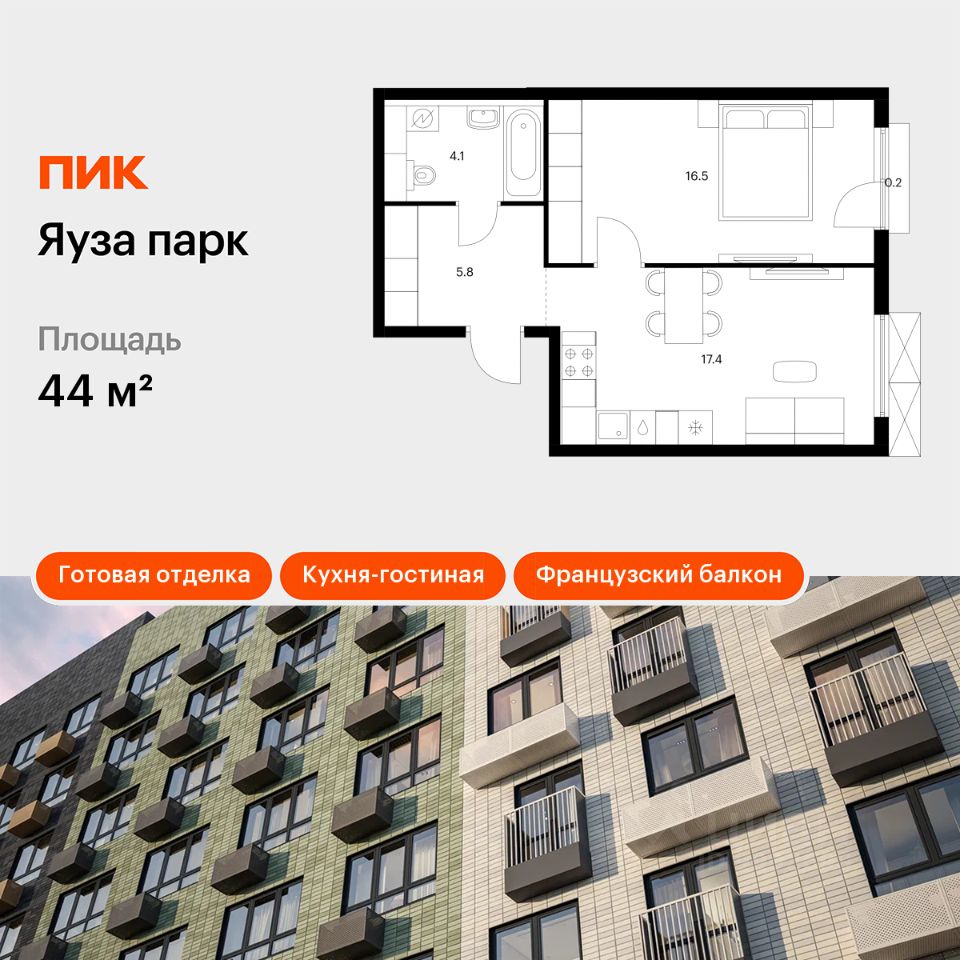 Продаётся 1-комн. квартира площадью 44 кв.м на 11 этаже 24 этажного дома (Корпус 5, Секция 1) проекта ПИК Яуза парк. Светлый просторный подъезд на уровне земли, функциональная планировка, большие окна, c отделкой.