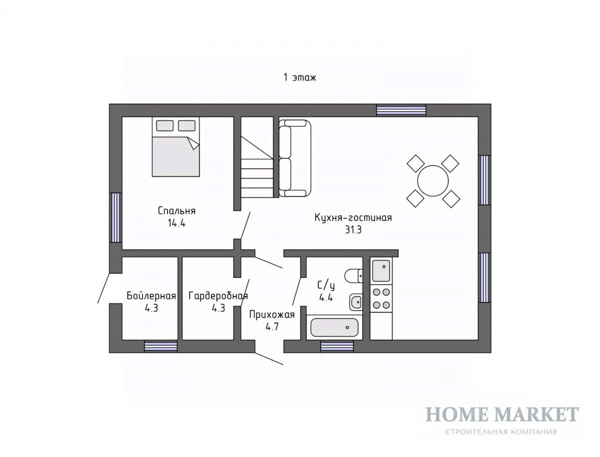 1 этаж: просторная кухня-гостиная с выходом на террасу, гостевая спальня, санузел с душевой, бойлерная, гардеробная,