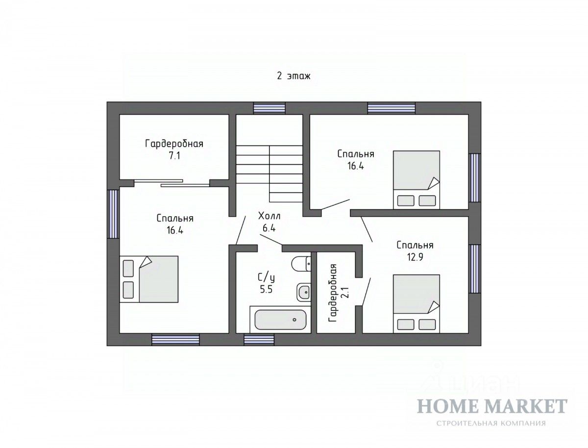 2 этаж: мастер- спальня с гардеробной, детская комната, спальня с гардеробной, ванная комната,