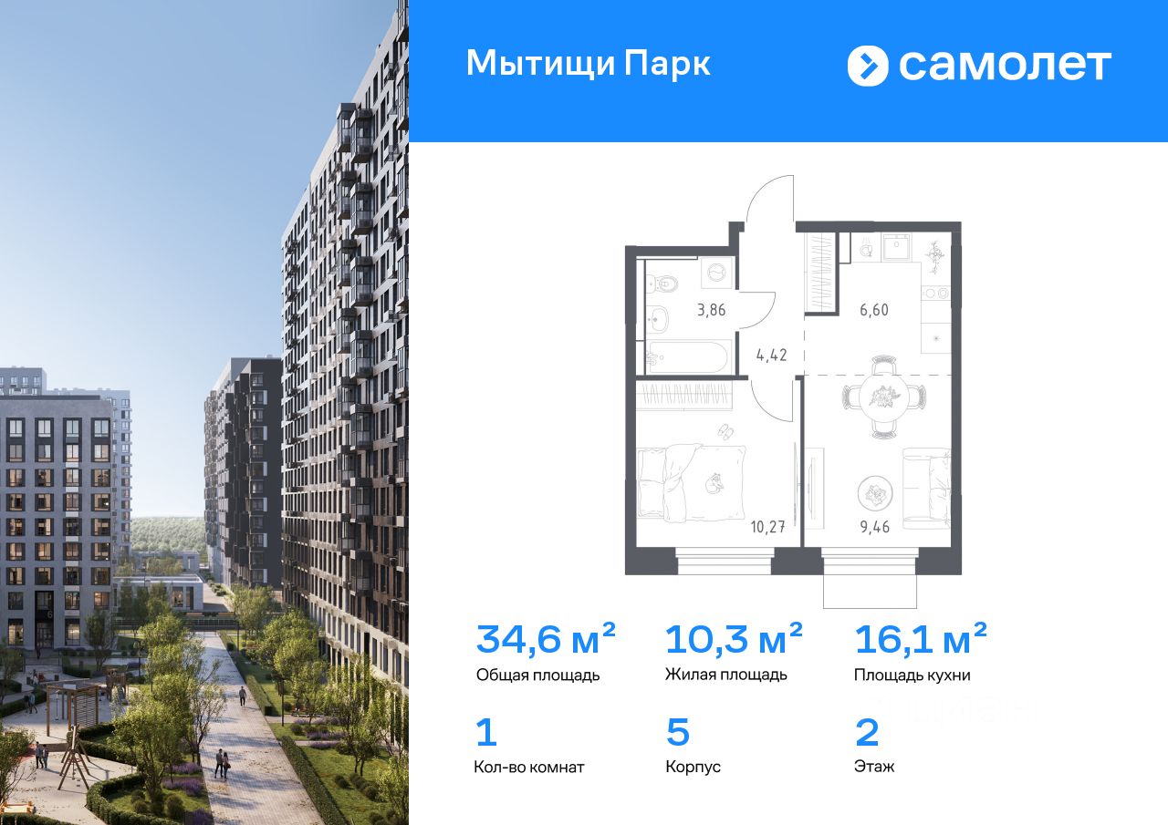 Предлагается 1-комнатная квартира комфорт-класса 34,61 кв.м в корпусе 5 на 2 этаже, в ЖК ''Мытищи Парк''