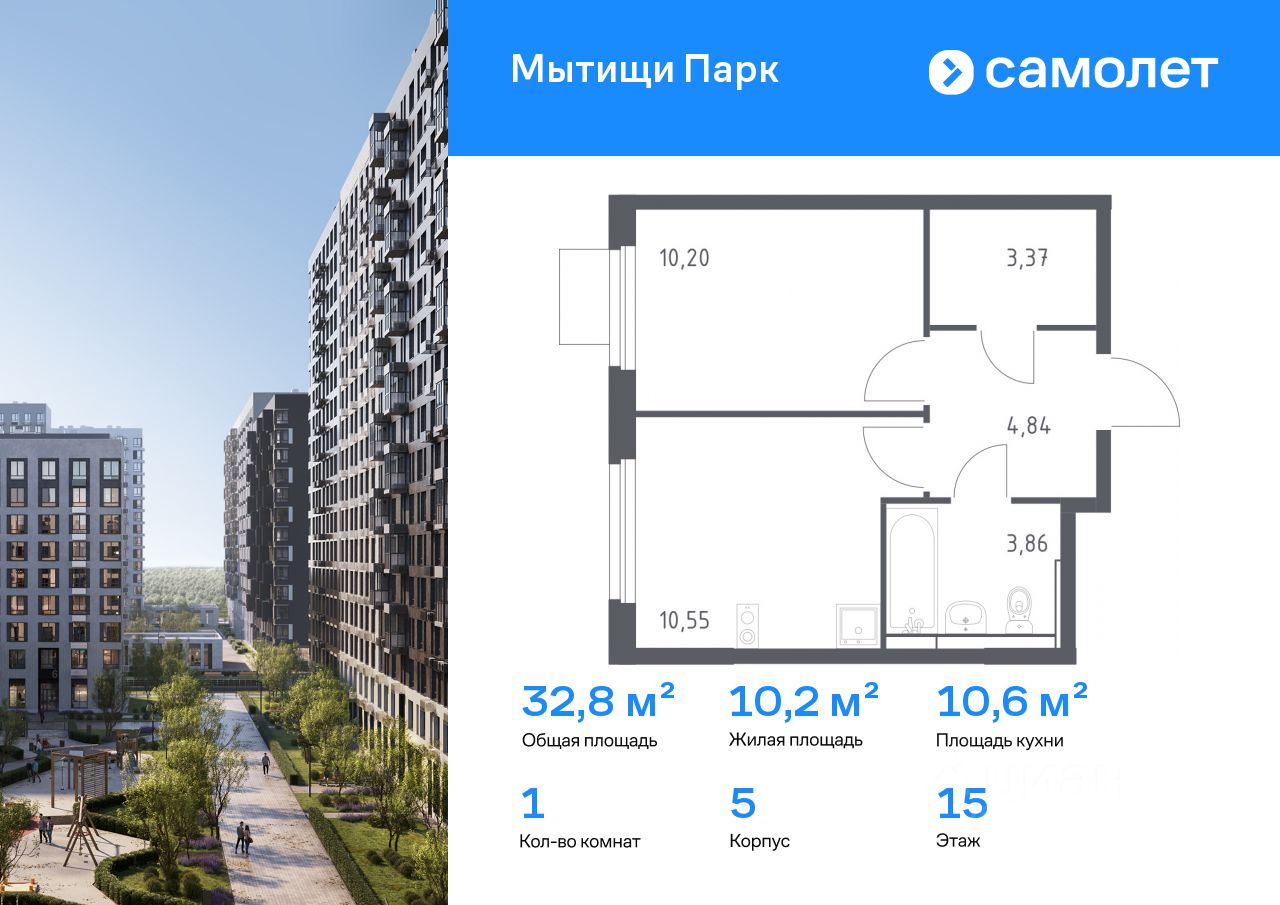 Предлагается 1-комнатная квартира комфорт-класса 32,82 кв.м в корпусе 5 на 15 этаже, в ЖК ''Мытищи Парк''
