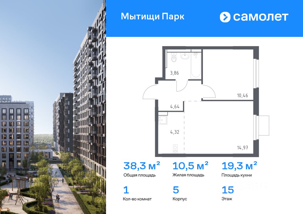 Предлагается 1-комнатная квартира комфорт-класса 38,25 кв.м в корпусе 5 на 15 этаже, в ЖК ''Мытищи Парк''