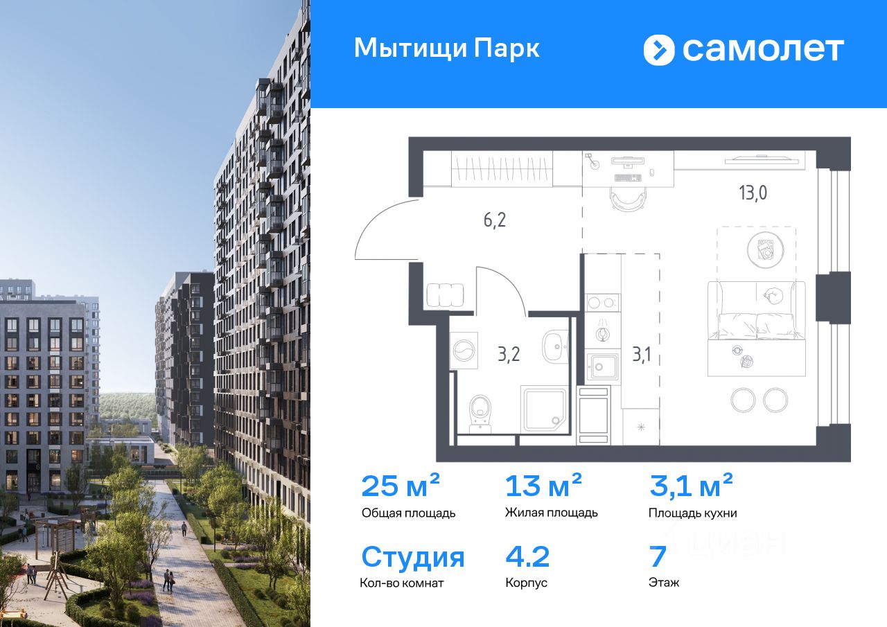 Строим кварталы для жизни с заботой о будущем. Предлагается квартира студия комфорт-класса 25 кв.м в корпусе 4.2 на 7 этаже, в ЖК ''Мытищи Парк''