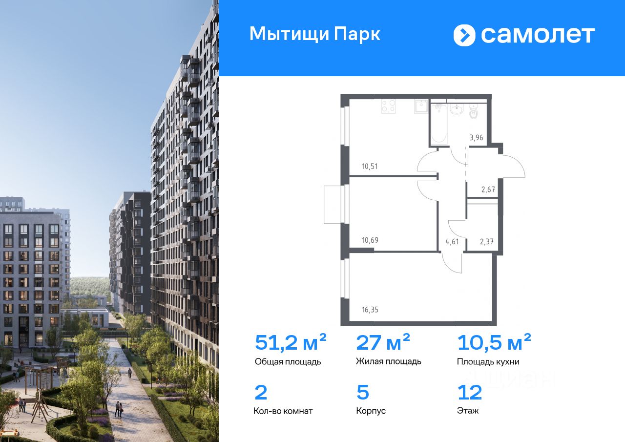 Предлагается 2-комнатная квартира комфорт-класса 51,16 кв.м в корпусе 5 на 12 этаже, в ЖК ''Мытищи Парк''